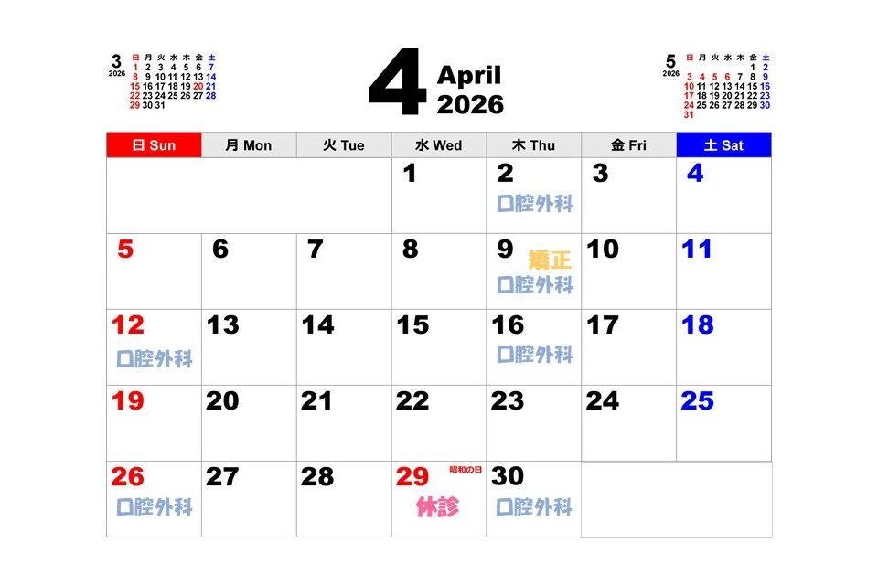 BLOG ブログ HOME ブログ お知らせ 4月の診療 2026.03.14 お知らせ 4月の診療 口腔外科、矯正の日程は上記のとおりです。 空欄は通常診療です。 4/29(水)は休診とさせていただきます。 ※1月より診療時間が変更となります。 月~土 9:00~18:30 日 9:00~18:00 ご迷惑をおかけしますが、よろしくお願いいたします。 記事一覧 次の記事へ